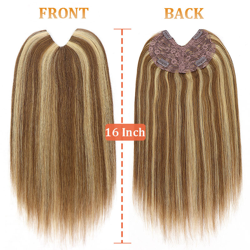 V-Part Human Hair Toppers For Women Breathable Lace Base 16Inch Blonde Highlight Invisible 4 Clips Hairpiece With Thinning Hair